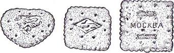 Формование. Формование сахарного теста осуществляется па ротационной машине путем запрессовывания теста в углубления формующего вала рифленым валом. На поверхности теста отпечатывается рисунок. Сформованные заготовки извлекаются из ячеек, ложатся на противни, движущиеся по цепному транспортеру формующей машины. Преимуществами ротационных машин являются высокая производительность при малых размерах и низкой энергоемкости, несложная конструкция, простота обслуживания и отсутствие обрезков теста. Но при использовании этих машин важно выдерживать требования к тесту по влажности и по температуре.
