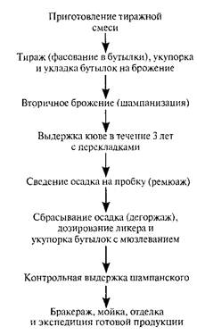 Состоит из следующих операций: приготовления тиражной смеси, розлива тиражной смеси в бутылки (тираж), выдержки, переведения осадка на пробку (ремюаж), удаления осадка (дегоржаж), введения экспедиционного ликера, укупоривания, выдержки и оформления бутылок.