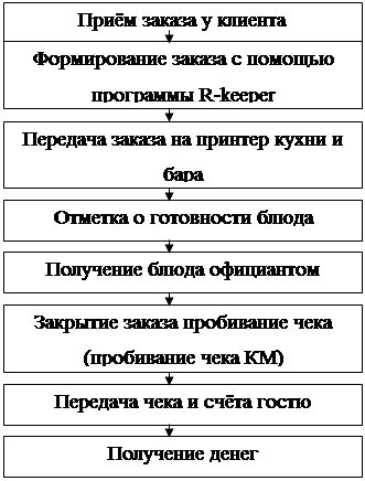 POS – терминалу с сенсорным вводом. С его помощью официанты оформляют предварительные заказы и отправляют их на производство. По окончании расчёта потребитель вносит деньги в кассу. Наличие кассира позволяет усилить контроль за работой обслуживающего персонала.