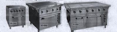 Модульная линия - солидная альтернатива недорогому маломощному настольному оборудованию. Практически все импортные плиты допускают как отдельную установку, так и монтаж в составе соответствующей модульной линии (600, 650, 700, 750, 800, 900 мм глубиной - отсюда и название серий "шестисотая", "семисотая" и т.д.) вместе с другими функциональными единицами, такими как фритюрница, стейк-мастер (жарочная поверхность), мармит, нейтральные вставки - обо всем этом речь пойдет дальше. Самые популярные модели: РС35 (350x600 мм, две конфорки по 2 кВт), РС70 (700x600 мм, четыре конфорки по 2 кВт), PF70 (четыре конфорки, конвекционная духовка, всего 10,5 кВт) производства Tecnoinox, Италия. Модели PC требуют установки на специальные подставки, входящие в состав модульной линии серии 600 от Tecnoinox. На том же уровне популярности Словенские плиты Kovinastroj моделей ES40 (две конфорки), ES60, ES80 (по четыре конфорки). Плита ES60 должна монтироваться на модульную подставку, a ES40 и ES80 могут быть установлены на серийную духовку ЕР80.