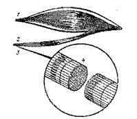 Рисунок 2- Строение мускула: 1 - мышца; - мышечный пучок; 3 - одиночное волокно; 4 - вид мышечного волокна в электронном микроскопе