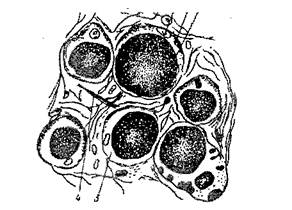 Рисунок 7 - Строение жировой ткани: 1 - жировая клетка; 2 - жировая капля; 3 - протоплазма; 4 - волоконца межклеточного вещества; 5 - ядро.
