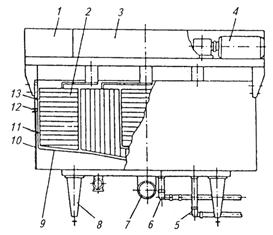 Рис.9.Сыроизготовитель Я5-ОСЖ-1:1-пульт управления; 2-режуще-вымешивающий инструмент; 3-траверса; 4-привод; 5-трубопровод для отвода теплоносителя; 6-трубопровод для подачи теплоносителя; 7-патрубок для выгрузки сырного зерна; 8-регулируемые опоры; 9-днище; 10-ванна; 11-теплообменная рубашка; 12-коллектор для подачи теплоносителя; 13-внутренняя емкость.