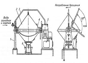 Рис.10. Маслоизготовитель периодического действия Р3-ОБЭ:1-опорная стойка; 2-емкость; 3-орошающее устройство (душ); 4-ограждение; 5-станина с коробкой скоростей; 6-тележка.