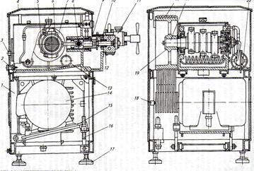 1 — станина; 2 — сливная пробка; 3 — маслоуказатель; 4 — крышка; 5 - кривошипно-шатунный механизм; 6— шатун; 7 - вкладыш; 8— палец; 9—ползун; 10 — плунжер; 11 — гомогенизирующая головка; 12 — плунжерный блок; 13 — змеевик; 14 — электродвигатель; 15— плита; 16— устройство для натяжения ремней; 17— опора; 18— ведущий шкив; 19— ведомый шкив; 20— клиновой ремень; 21 — коленчатый вал; 22 — маслонасос.