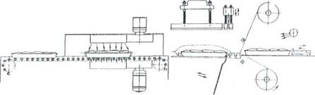 При больших объемах производства обычно выбирают машины непрерывного действия, устроенные по бесконтактному способу упаковывания (рис. 5.1). В машине для упаковывания полуфабрикатов в термоусадочные пленки вакуумную камеру заменяют термоусадочным туннелем. Подложку с полуфабрикатами укладывают на нижнюю пленку между ограничителями конвейера, который движется синхронно с нижней пленкой. Расстояние между двумя ограничителями определяет длину пакета. Сверху продукт накрывается другой пленкой. Продольные швы образуются непрерывно с помощью нагревательных элементов, к которым пленки прижимаются фторопластовыми роликами.