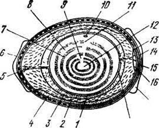 1 - градинковый слой белка; 2 - плотный слой белка (белковый мешок); 3 - внутренний жидкий слой белка; 4 - наружный жидкий слой белка; 5 - градинки; 6 - белковая связка; 7 - темные слои желтка; 8 - светлые слои желтка; 9 - шейка латебры; 10 - бластодиск; 11 - ядро Пандера; 12 - латебра; 13 - подскорлупная оболочка) 14 - надскорлупная пленка; 15 - скорлупа; 16 - воздушная камера; 17 - белковая связка; 18 - желточная оболочка