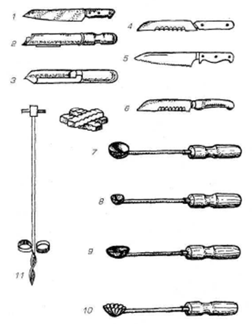 1 – коренчатый нож; 2 – желобковый нож; 3 – нож для доочистки; 4 – нож для нарезки лука; 5 – нож для нарезки помидоров; 6 – гофрированный нож; 7, 8, 9, 10 – фигурные выемки; 11 – приспособление для фигурной нарезки овощей.