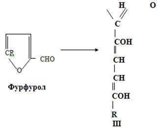 Фурфурол, образующийся при дегидратации сахара, даёт после гидролиза соединение с восстанавливающими свойствами. После гидролиза с расщеплением кольца усиливается сопряжённая диэндиольная структура III, причём R может обозначать группы H, CH2, OH, CH3 в зависимости от природы имеющегося фурфурола:
