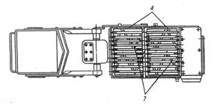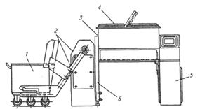 1 - тележка; 2 - устройство загрузки; 3 - корыто; 4 - решетка; 5 - привод; 6 - станина; 7 - лопасти месильные