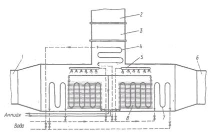 1— нижняя камера для подачи воздуха; 2 — верхний воздухоотвод; 3 — вентилятор; 4, 7 — дополнительные обогреватели; 5 — трубопровод для орошения теплой водой; 6 — камера для подачи воздуха; 8 — испаритель