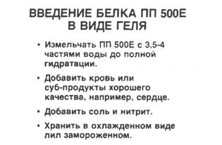 Максимальное преимущество дает добавление «ПП 500Е» в виде геля белок: вода с соотношением белок: вода равным 1:3,5 — 1:4. Методика заключается в следующем: