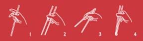 Возьмите палочки в руки так, чтобы вам было удобно, но в любом случае прихватите их пальцами выше середины, ближе к толстому концу. Беря еду с общего блюда, держите их концами от себя. В то время, когда палочками не пользуются, их обычно кладут справа от тарелки.