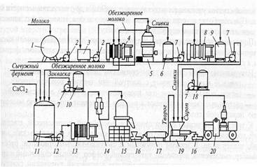 Обезжиренное молоко из сепаратора поступает в пластинчатую пастеризационно-охладительную установку 4, где сначала пастеризуется при температуре 78°С с выдержкой 15 - 20 с, а затем охлаждается до 30 - 34°С и направляется в резервуар 11 для сквашивания, снабженный специальной мешалкой. Закваска, приготовленная в заквасочнике 10, насосом 7 подается в резервуар 11 для заквашивания. Сюда же подаются хлорид кальция и фермент, смесь тщательно перемешивают и оставляют для сквашивания до кислотности сгустка 90 - 116°Т, а если используется ускоренный способ сквашивания молока, то 85 - 90°Т. При сепарировании сгустка с меньшей кислотностью сопла сепаратора могут засориться.