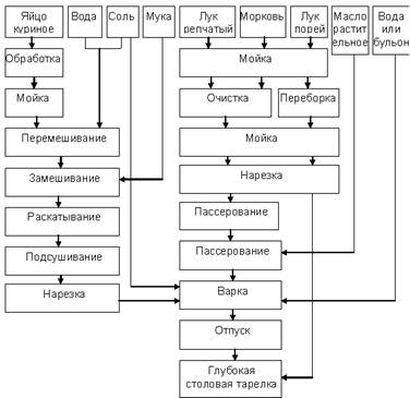 В кипящий бульон или воду кладут пассерованные морковь, лук и варят с момента закипания 5-8 минут, после чего добавляют подготовленную лапшу и варят до готовности. |