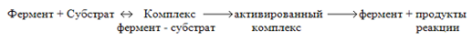 Ферменты ускоряют реакции в десятки тысяч и миллионы раз. Действие ферментов строго специфично, т. е. каждый фермент катализирует только одну химическую реакцию. Фермент соответствует своему субстрату (веществу, химическое превращение которого он катализирует). На первой стадии ферментативной реакции фермент соединяется с субстратом и образуется так называемый фермент-субстратный комплекс, который затем преобразуется с разрывом химических связей субстрата, и продукты реакции отщепляются от фермента.