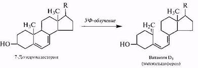 Витамин В (кальциферол). Этот витамин регулирует фосфорно-кальциевый обмен в организме человека. Его недостаток в пище нарушается процесс отложения в костях солей кальция и фосфора, что приводит к заболеванию рахитом. Витамин D образуется в организме животных и человека из провитамином — стеринов — при их ультрафиолетовом облучении: