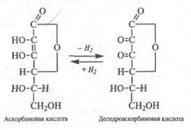 Аскорбиновая кислота (витамин С). Она участвует в окислительно-восстановительных процессах, происходящих в организме. Недостаток витамина С в пище может вызывать цингу. По своему строению аскорбиновая кислота близка к гексозам. Она легко окисляется в дегидроаскорбиновую кислоту, которая, присоединяя два атома водорода, восстанавливается в аскорбиновую кислоту: