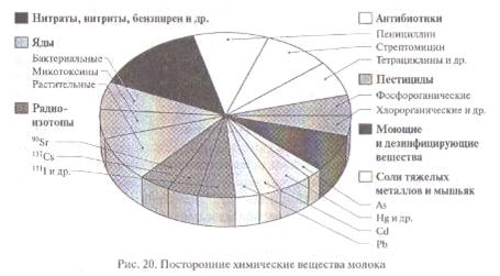 Из организма животного в молоко могут переходить различные химические вещества, опасные для здоровья человека. Некоторые из этих веществ затрудняют технологические процессы при выработке молочных продуктов, снижают их качество и пищевую ценность. К посторонним химическим веществам молока относятся антибиотики, пестициды, моющие и дезинфицирующие вещества, соли тяжелых металлов, радиоактивные вещества, токсины, нитраты, нитриты, бенз(а)пирен, диоксины и пр.
