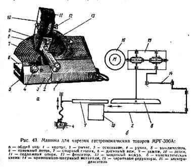 Машина комплектуется двумя сменными лотками. Один предназначен для нарезки продуктов под углом от 30 до 90° к их оси, другой — для нарезки под прямым углом. Лотки представляют собой пустотелые короба без дна и крышки, между стенками которых установлены две подвижные опоры, ограничивающие продольные и поперечные передвижения находящегося в лотке продукта. Для крепления опор служат фиксаторы, расположенные на определенном расстоянии от стенок лотка. Движение от электродвигателя через червячный редуктор передается дисковому ножу и рычагу с лотком. Для преобразования вращательного движения в качательное между редуктором и рычагом установлен кривошипно-шатунный механизм.