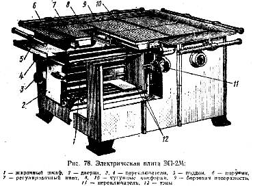 Жарочный шкаф представляет собой двухстенный металлический короб с теплоизоляцией между стенками. Размеры шкафа 700X550X300 мм. Закрывается он откидной двухстенной дверкой, плотность прилегания которой к корпусу шкафа обеспечивается пружиной. Дверка имеет вентиляционное отверстие, закрываемое заслонкой. Предназначено оно для выпуска пара, образующегося в шкафу во время тепловой обработки продуктов. Для установки противней с продуктами жарочный шкаф имеет съемную полку-решетку, которую можно располагать на различной высоте. Шкаф обогревается восьмью тэнами: по четыре штуки сверху и снизу; нижние тэны прикрыты металлическим листом. Рядом с дверкой шкафа расположены два пакетных переключателя для верхних и нижних тэнов и терморегулятор типа ТР-4К, назначение которого — поддерживать заданную температуру в автоматическом режиме в пределах от 100 до 350°С.
