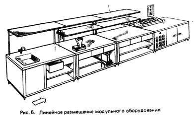 Для организации рабочего места повара устанавливают модульные секции — столы с охлаждаемым шкафом и горкой для хранения компонентов холодных блюд, с встроенной ванной, над которой укреплен смеситель холодной и горячей воды с гибким шлангом и душевой насадкой. Под столешницей предусмотрены вспомогательная полка для хранения посуды и выдвижные ящики (рис.6). Удобен стол-секция с ящиками и полками, предназначенный для установки и подключения к электрической сети средств малой механизации.