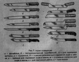 В цехе организуют отдельные рабочие места для изготовления холодных блюд и закусок, сладких блюд и бутербродов. Из оборудования используют универсальный привод, овощерезку с набором различных ножей, хлебо-, колбасо- и ветчинорезки, приспособления для нарезки масла, сыра, а также разнообразные выемки, ножи, посуду и формы. Большое значение имеет оформление холодных блюд и закусок, а их привлекательность зависит от формы нарезки, цветового сочетания и расположения продуктов и, конечно, от квалификации повара. Количество необходимой посуды, тары и производственного инвентаря (рис.7) определяют в зависимости от объема выпускаемой продукции, ассортимента блюд и кулинарных изделий.