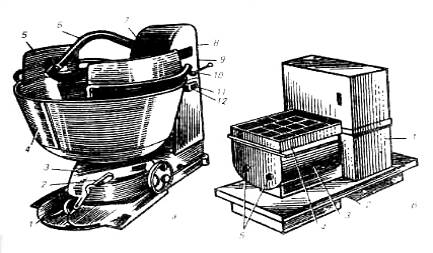 Тестомесильные машины ТММ-1М и МТМ-15: а)ТММ-1М: 1 – фундаментальная плита, 2 – педаль, 3 – тележка, 4 – дежа, 5 – щиток, 6 – месительный рычаг, 7 – шарнир, 8 – крышка, 9 – корпус, 10 – рукоятка, 11 – кнопочный выключатель, 12 – панель. Б) МТМ-15:1 – редуктор, 2 – платформа, 3 – съемный резервуар, 4 – решетка, 5 – месильные лопасти.