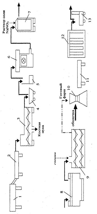 После варки батоны охлаждают под душем холодной водой с температурой 8°С в течение 10 минут в оросительной камере (16). После охлаждения под душем колбасные изделия охлаждают до температуры в центре батона не ниже 0°С и не выше 15°С в камере охлаждения (17) при температуре 4°С и относительной влажности воздуха 95 %.