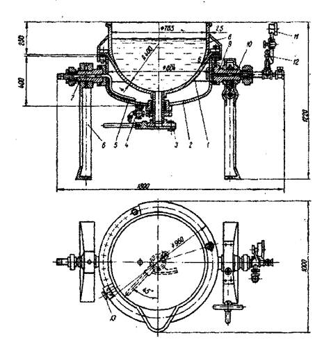 Первый из них (рис. 1.2) состоит из медной полусферической чаши 1 и обечайки 8 с носиком для слива. Чаша котла помещена в стальную сварную паровую рубашку 2 и соединена с ней с помощью фланцев. Котел крепится к стойкам 6 при помощи пустотелых цапф 7 и 9, вращающихся в подшипниках. Пар подводится через правую цапфу 9, а конденсат отводится по трубе 5 через левую цапфу 7. Предохранительный клапан 12 и манометр 11 устанавливают на входной трубе для пара. Выгрузка готовой продукции производится путем опрокидывания котла вручную при помощи червячной пары 10, смонтированной в стойке на цапфе 9, или открытием затвора 3 на штуцере, находящемся в нижней части котла. Спуск воздуха из паровой рубашки производится через кран 13, спуск конденсата - через кран 4.