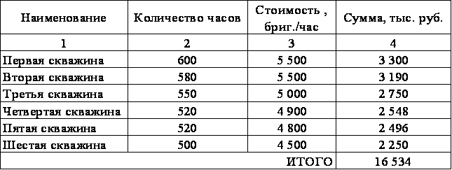 Для того чтобы расконсервировать скважины необходимо нанять бригаду, стоимость работы бригады один час составляет от 4500 - 5500 руб. Время на расконсервацию одной скважины уходит от 500 - 600 часов. Упрощенно время работы и стоимость работы бригады зависит от сложности работы и от глубины скважины. Расчет данных показателей приведен в таблицах 3.1 и 3.2.