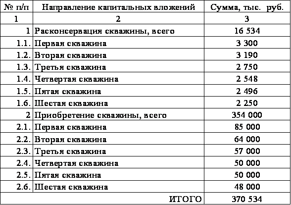 Общая сумма капитальных вложений на приобретение новых скважин включает в себя следующие затраты: