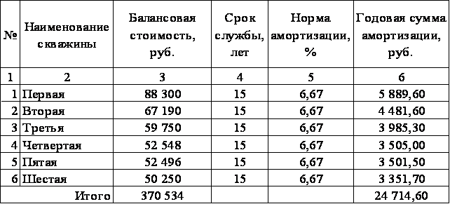 На основе данных о стоимости скважин рассчитывается годовая сумма амортизационных отчислений, которая равна отношению суммы произведения нормы амортизации по i – группе основных производственных фондов и балансовой стоимости i – группы основных производственных фондов к 100%.
