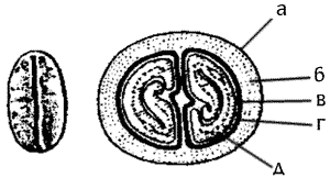 Рис. Кофейное зерно и его поперечный разрез: а - экзокарп, б - мезокарп, в - эндокарп (пергаментная оболочка), г - семенная кожура (серебристая пленка), д -эндосперм