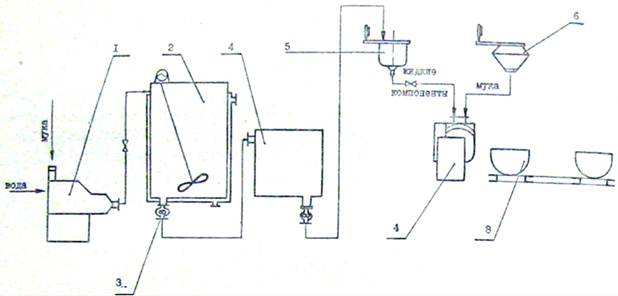1 - смеситель винтовой Ш2-ХВ2-Б; 2 - аппарат для выбраживания КМКЗ Ш2-ХТД-01.01; 3 - насос шестеренчатый Ш2-ХДН; 4 - расходная емкость Ш2-ХТД-01.02; 5 - дозатор жидких компонентов Ш2-ХД2-Б; 6- дозатор сыпучих компонентов Ш2-ХД2-А; 7- тестомесильная машина Ш2-ХТ2-И; 8 - конвейер для брожения теста Ш-ХБВ.