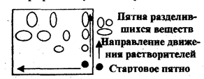 Иногда при сложном составе пробы не удается разделить ее компоненты с помощью одного растворителя. Тогда применяют двумерную хроматографию. В угол квадратного листа хроматографической бумаги наносят хроматографической бумаги наносят раствор пробы и хроматографируют сначала в одном элюенте, затем, повернув хроматограмму на 90, - в другом. Первый элюент производит предварительное разделение компонентов пробы, второй окончательное.