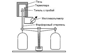 Принцип работы термовесов следующий. Пробу помещают в тигель (рис. 3), опирающийся на коромысло весов. Затем тигель нагревают в электрической печи так, чтобы его температура равномерно повышалась. Температура печи измеряется с помощью находящейся в ней термопары, к концам которой подключен милливольтметр, и время от времени (например, каждые 5 .10 К) масса образца фиксируется.