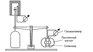 С коромысла термовесов одна чашка была удалена и вместо нее подвешена катушка с большим числом витков, которая помещалась в гомогенное поле двух подковообразных постоянных магнитов и подключалась к клеммам гальванометра высокой чувствительности.