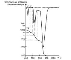 Проведенные испытания показали, что истолкование основной кривой значительно облегчается одновременной записью деривативной термогравометрической кривой (ДТГ). Анализ последней дает более полную и правильную картину происходящих в пробе термических превращений. Следующие почти непрерывно друг за другом процессы на кривой термогравиметрии смешиваются, на деривативной же кривой они четко разделены.
