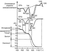 Характер и ход обеих кривых существенно отличаются друг от друга, как это следует, например из анализа термограммы боксита месторождения "Нежа" (рис. 9 – пунктирные линии изображают кривые, полученные по отдельности аппаратами ДТА и ТГ, а непрерывные – кривые, полученные дериватографом). С математической точки зрения, кривая ТГ, выражая зависимость изменения массы от температуры, является интегральной кривой, а кривая ДТА, означающая зависимость частного дифференциала изменения энтальпии от температуры, является производной от интегральной зависимости изменения энтальпии с ростом температуры. Используя метод ДТГ, удалось ликвидировать связанные с этим трудности: производная кривая изменения массы (кривая ДТГ) во многом сходна с кривой производной изменения энтальпии (кривая ДТА) вследствие математического сродства обеих зависимостей, и, таким образом, их сопоставление уже не встречает затруднений (см. рис. 9).