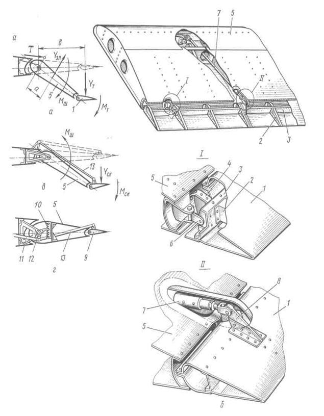 5. Триммер 1 (см. рис. 2, в и рис. 3, а)— вспомогательная рулевая поверхность, расположенная в хвостовой части элерона (руля) 5 и предназначенная для уменьшения (снятия) усилий на рычагах управления самолетом при изменении режима полета. Сила на триммере Yт, подобно тому, как и сила Yск, создает момент Mт=Yтb относительно оси вращения руля, уменьшающий шарнирный момент Mш = Th. Это приводит к уменьшению потребных усилий T в системе управления и, в конечном счете, к уменьшению усилий на командных рычагах управления. Эти усилия могут быть снижены вплоть до нуля при Мт=Уэла (см. рис. 3, а).