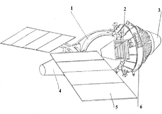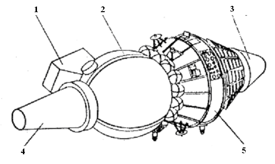 1 – бленда звездного фотоаппарата; 2 – спускаемый аппарат; 3 – тормозная двигательная установка; 4 – корректирующая двигательная установка; 5 – приборный отсек