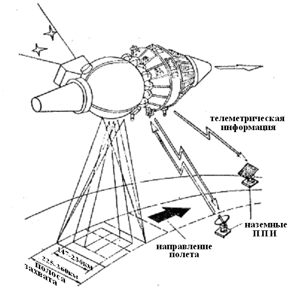 Ширина полосы фотографирования и фотографируемая площадь с высоты 250 км составляет соответственно 225 км и 27 млн. км2 при многозональной съемке и 147 км и 16 млн. км2 при спектрозональной съемке.