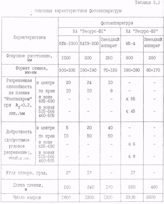 - два длиннофокусных широкоформатных аппарата КФА-1000 с размером кадра 300х300 мм и фокусным расстоянием 1000 мм, ведущие съемку в спектральном диапазоне 570 ‑ 800 нм, позволяющие получать спектрозональные снимки (в каждом аппарате по 1200 кадров) с разрешением до 6 - 8 м, которое последующей обработкой может быть улучшено до 2 - 4 м.