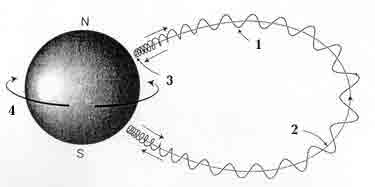 РИС. 1 В геомагнитном поле заряженные частицы с определёнными скоростями могут захватываться в так называемые „магнитные бутылки“: траектории электронов и протонов (1) длительное время „привязаны“ к силовым линиям (2), многократно отражаясь от их околоземных концов (3) и медленно дрейфуя вокруг Земли (4).