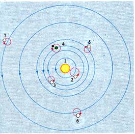 В десятой главе описывается картина гелиоцентрической системы мироздания и приведен знаменитый рисунок (рис.2), на котором указано расположение небесных сфер. В системе Коперника Солнце (1) находится в центре Солнечной системы, вокруг него обращаются Меркурий (2),Венера (3),Земля (4), Марс (5), Юпитер (6), Сатурн (7).