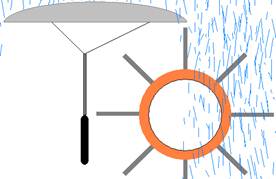 Рис. 4.На этом рисунке элементарное водяное колесо вращается под действием неуравновешенных сил водного потока, льющегося на лопасти сверху. Неуравновешенные силы создаются за счет того, что одна сторона лопастей водяного колеса укрыта зонтом. Вывод; - если бы можно было укрыть одну сторону лопастей от упругих продольных волн (гравитации), то созданные таким искусственным способом неуравновешенные гравитационные силы так же вращали бы колесо мельницы. Но уже не водяной, а – гравитационной.