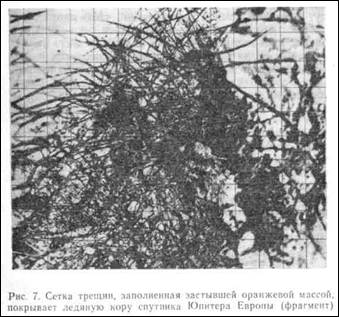 5.Обнаружено слабое кольцо Юпитера. Подробно исследованы галилеевы спутники. Ио имеет более десяти действующих вулканов, поверхность планеты состоит, по-видимому, из серы и диоксида серы. Спутник Европа (рис. 7) покрыт мощной ледяной корой, под которой, возможно, существует глобальный океан. Ганимед, самый крупный спутник в Солнечной системе, имеет развитую тектонику, подобную тектонике плит Земли. По диаметру он больше Меркурия.