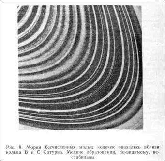 4. Шесть колец, известных еще до полета "Вояджеров" состоят из бесчисленных индивидуальных "колечек" (рис. 8). Наблюдались споки — особые образования на кольцах. Кольца обладают сложной, меняющейся динамикой. Обнаружены "пастухи" кольца F и других колец.
