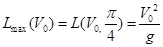 А после подстановки данного выражения обратно в зависимость дальности, найдем максимальное расстояние броска, которое можно обеспечить при заданной начальной скорости